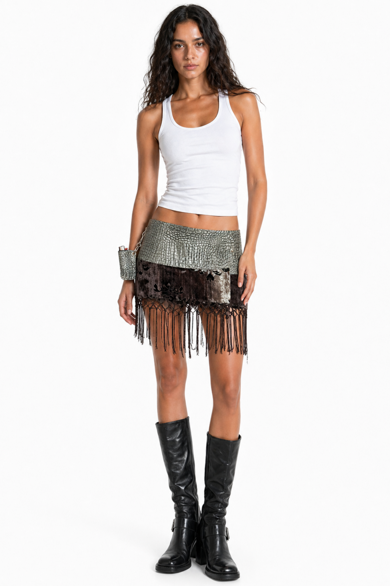 BELTED MINI — STONE CROC / VELVET FRINGE